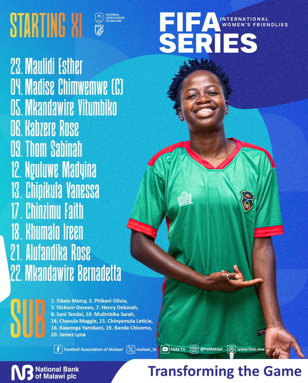 23 MAULIDI Esther, 4 MADISE Chimwemwe ©, 5 MKANDAWIRE Vitumbiko (19 BANDA Chisomo 73′), 6 KABZERE Rose, 9 THOM Sabinah(10 MULIMBIKA Sarah 50′), 12 NGULUWE Madyina, 13 CHIPIKULA Vanessa (7 HENRY Deborah 33′), 17 CHINZIMU Faith, 18 KHUMALO Ireen, 21 ALUFANDIKA Rose, 22 MKANDAWIRE Bernadetta